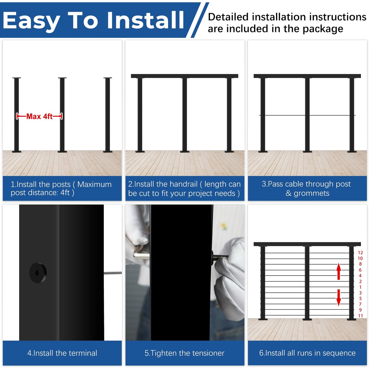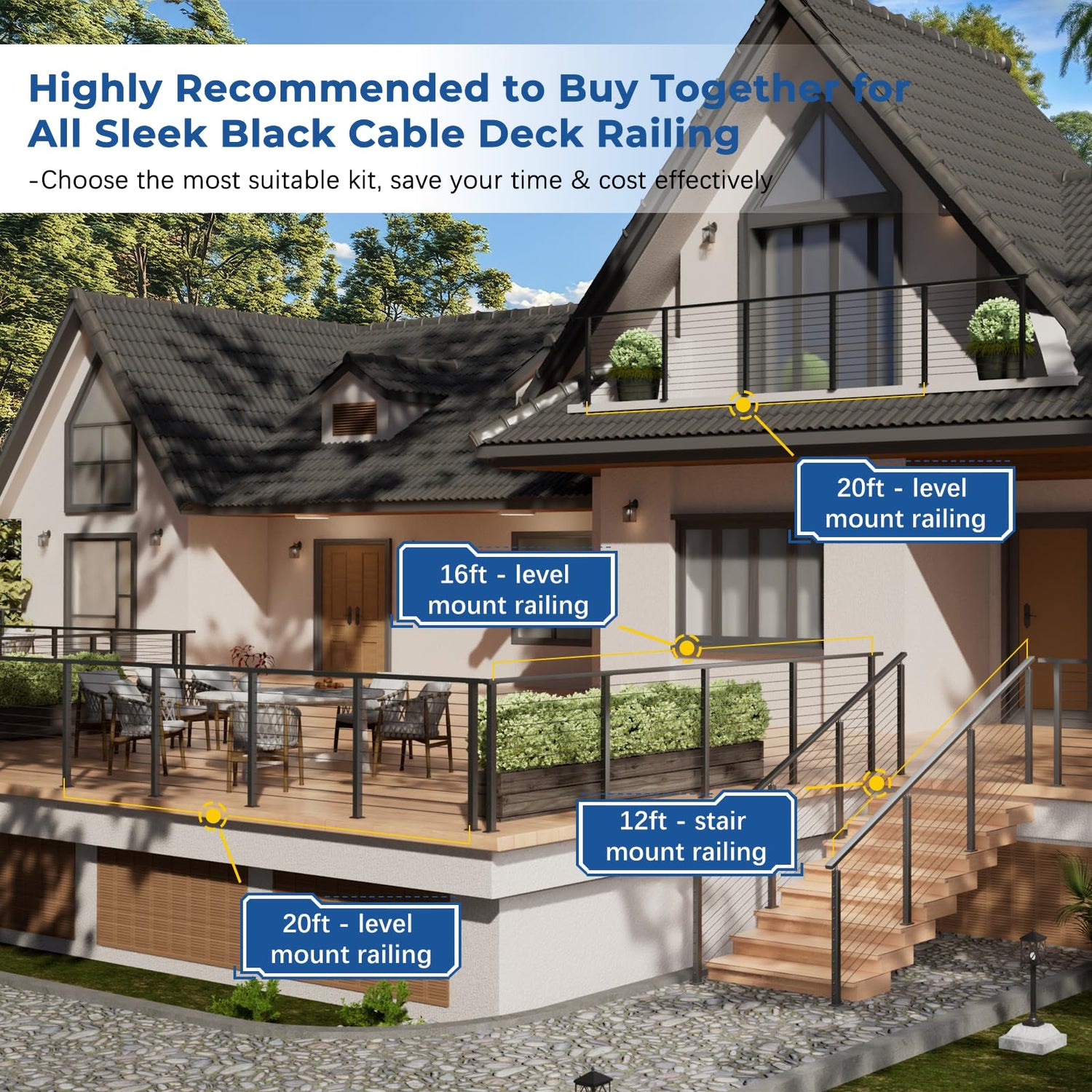 - Beginner Friendly: You don’t need to search for and select the individual components like posts, handrails, cables, and other items for your cable railing system. Our complete cable railing kits include everything you need for your project. Simply measure the length of your installation site and select our appropriate set(SKU) based on your project's specifications. It’s quick and easy to assemble, so you can finish your project efficiently