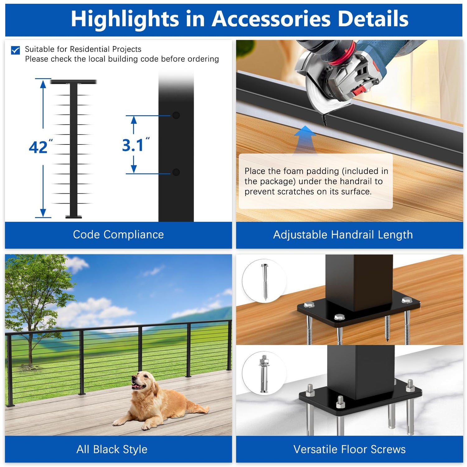 - Code Compliance: Our deck railing kit is meticulously designed at a height of 42" and allows for a maximum span of 4 ft/1.2 m between posts, ensuring full compliance with local cable railing codes and making it suitable for both commercial and residential projects (please ensure to review local cable railing codes before making a purchase, as requirements may vary by state.)