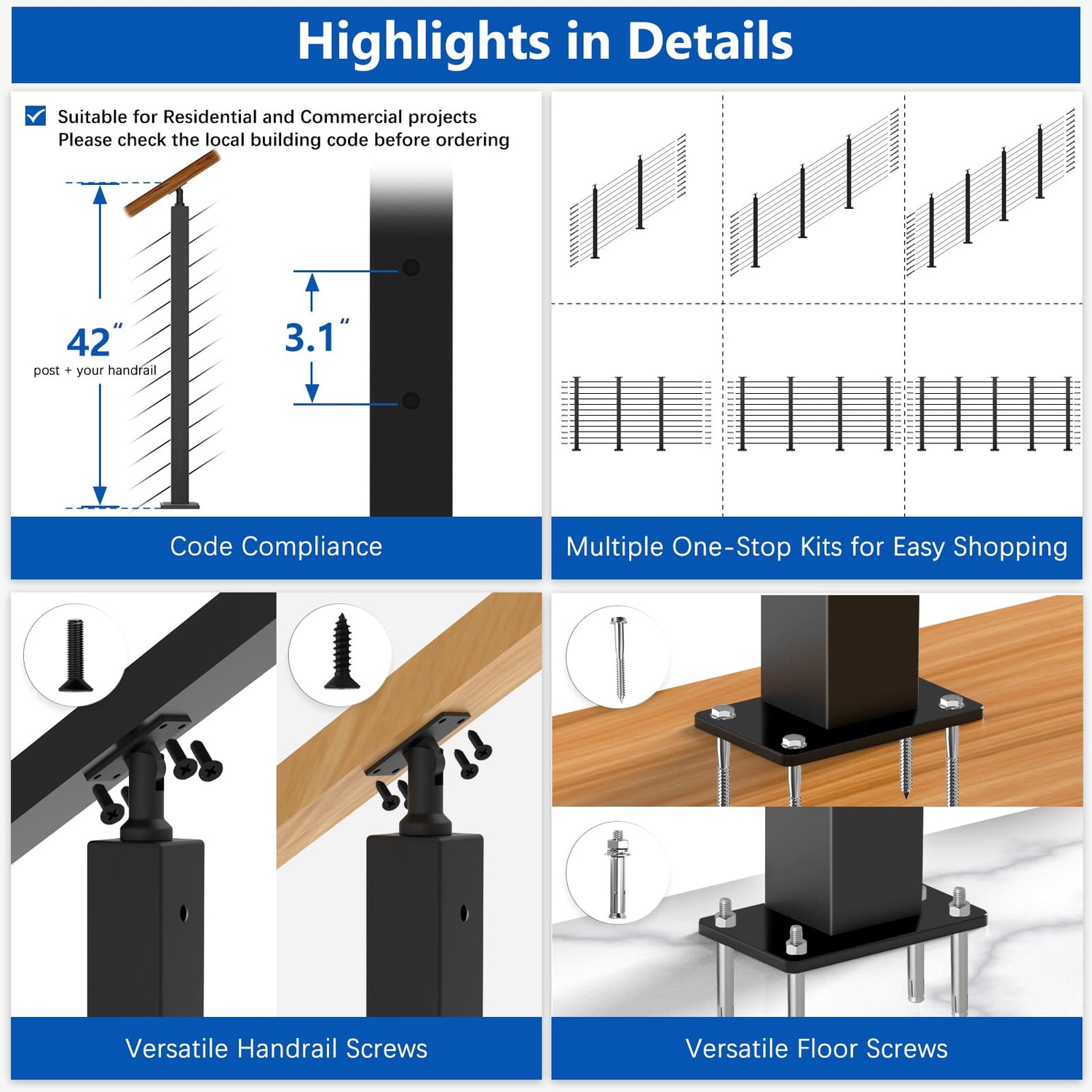 - Safety Compliance: Our 42-inch wire railing post kit meets building codes for both commercial and residential use, featuring 3” cable spacing and a total height of 42” (when paired with your handrails). It supports a maximum cable run of 20 ft and post spacing of 4 ft, ensuring safety and proper cable tension. Please verify your local building codes before purchase