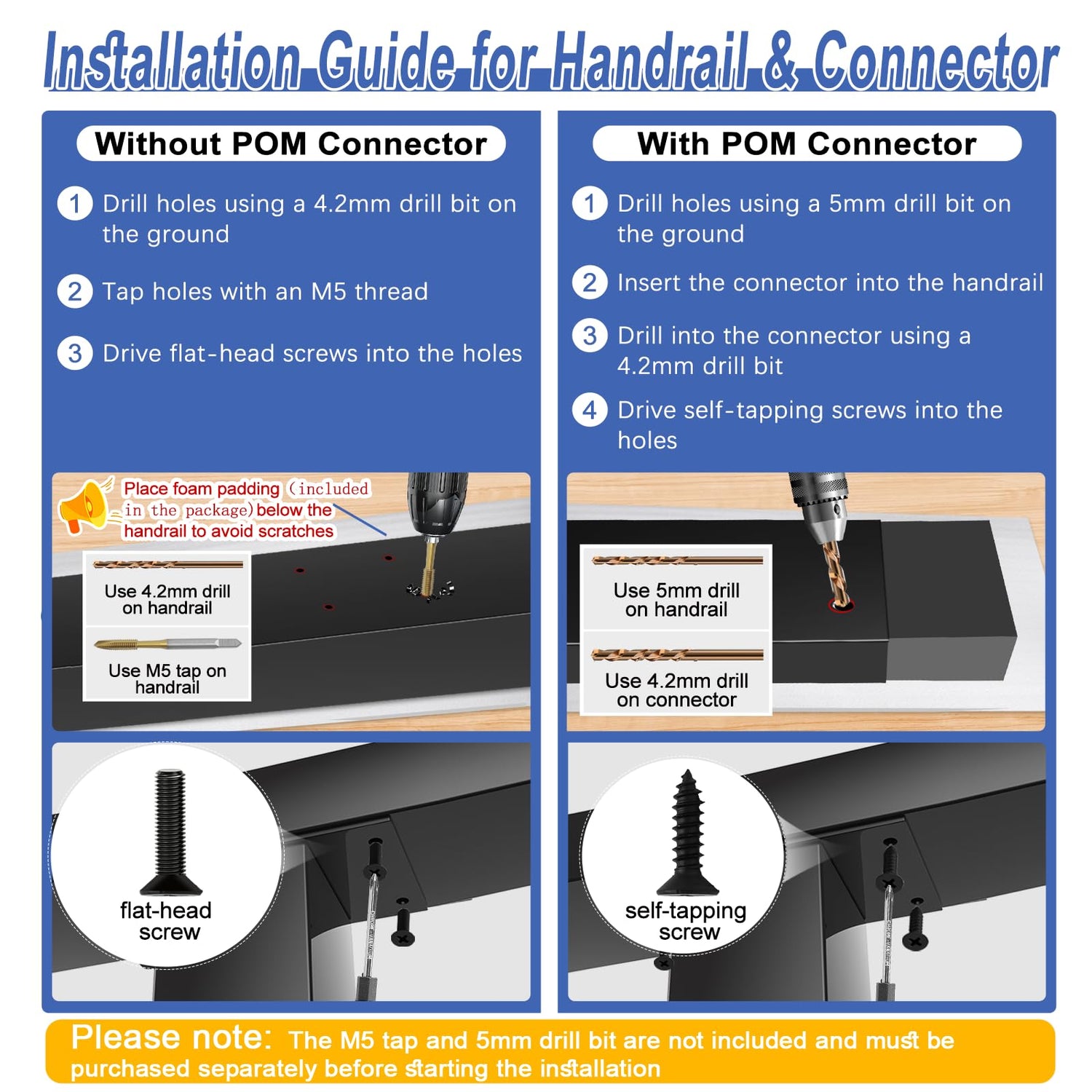 - How to Install: Each package includes clear installation instructions, and our support team is always here if you require any assistance. To achieve the best appearance for the handrail, wrap the included foam padding around the handrails to prevent scratches on their surface. Clean it with a soft cloth dampened with warm water immediately after installation and weekly thereafter (Attenion: Always wear safety goggles or a face shield when using your drill or saw)