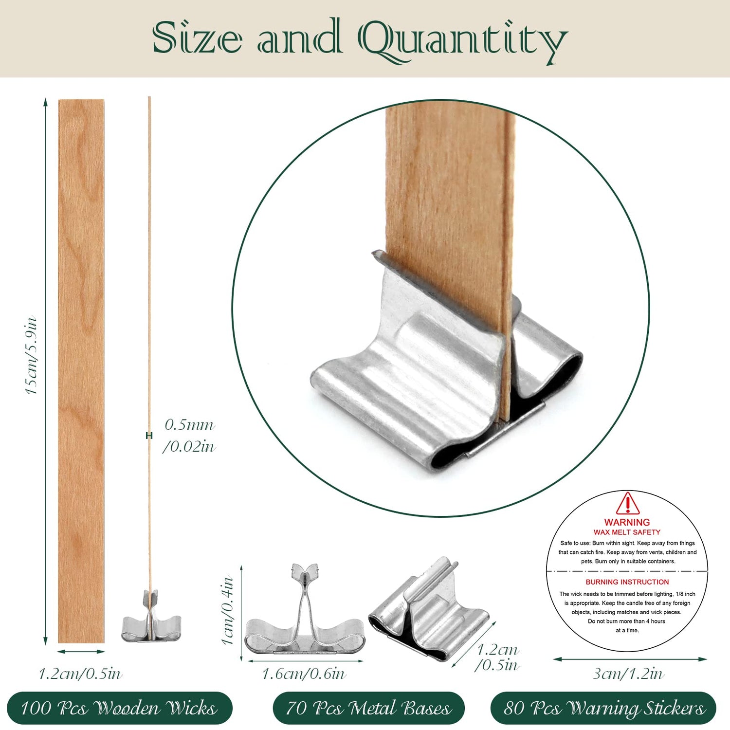 - LARGE QUANTITY: In this candle making supplies set, you will receive 100 pcs candle wicks for candle making, 70 pcs metal bases and 80 pcs warning stickers. The dimensions of the wood wick are 5.9in long, 0.5in wide and 0.02in thick