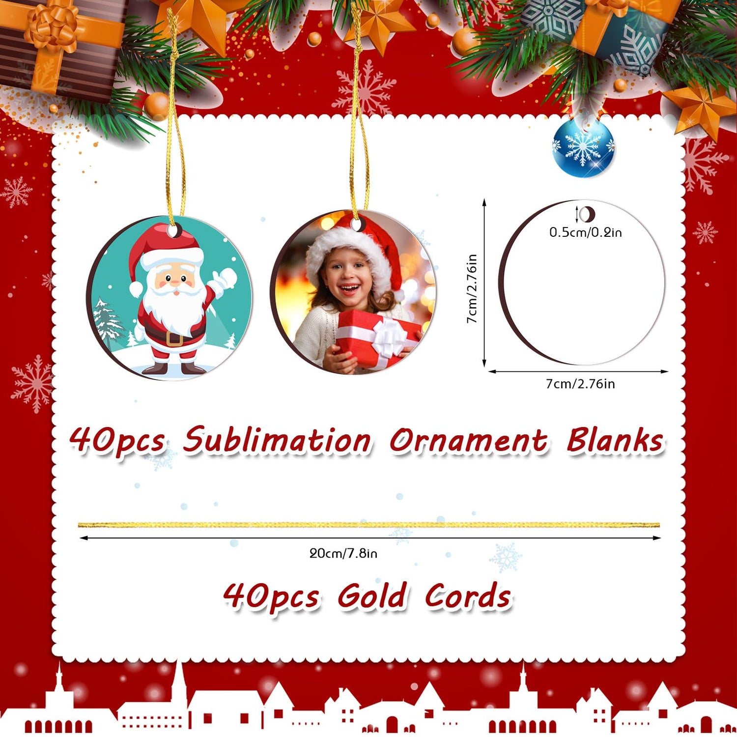 - SUBLIMATION ORNAMENTS KIT: You will receive 40 pieces of bulk sublimation ornament blanks, each blank comes with a gold cord. These acrylic ornament blanks are 7 cm/2.76 inches in diameter and 3 mm/0.12 inches in thickness. Ample quantity and suitable size for you to share DIY craft time with your family