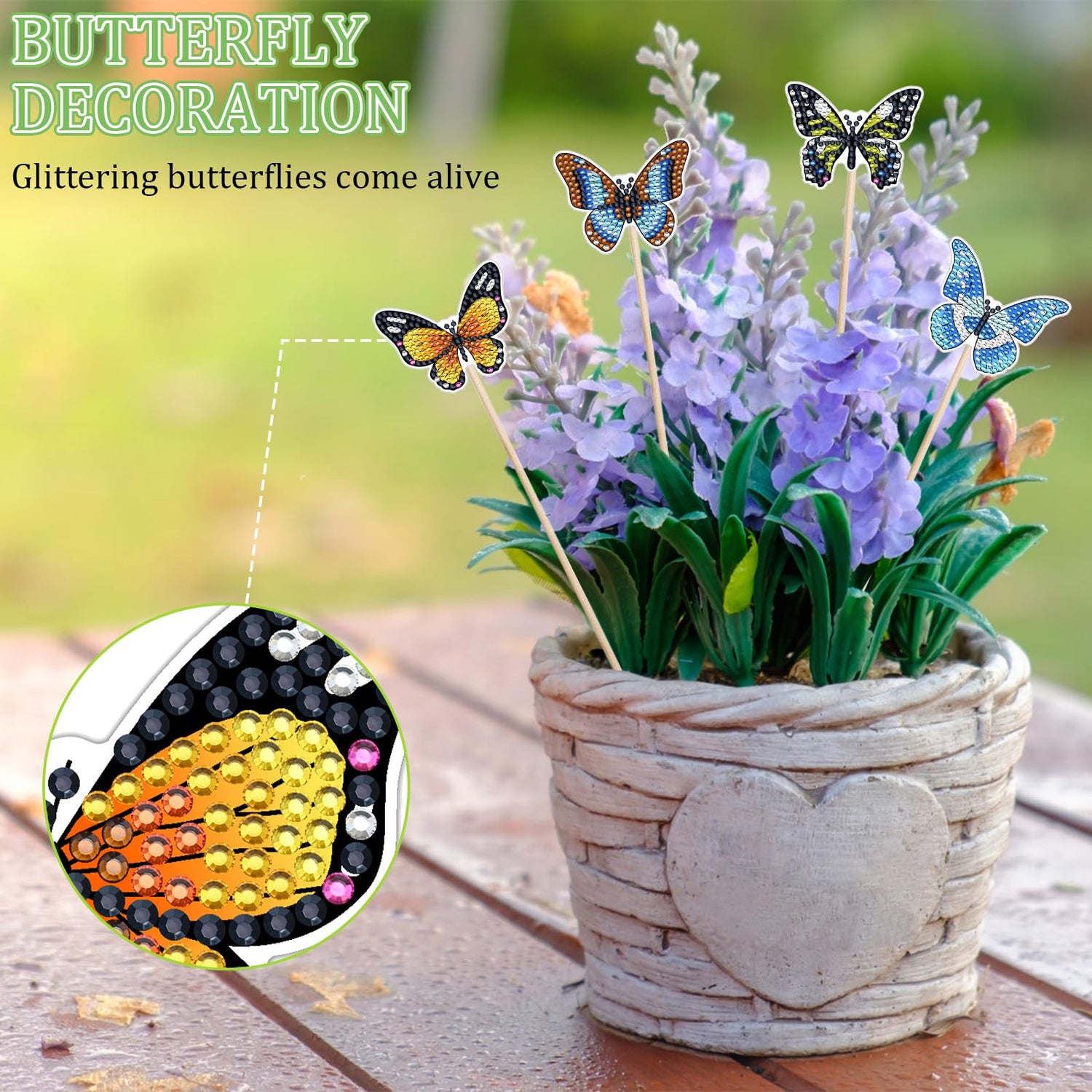 - DIAMOND PAINTING GARDEN DECORATION: Butterfly diamond art kit can be used to decorate potted plants, gardens, patios, birthday parties, weddings, etc., the unique garden decoration is beautiful and eye-catching, adding artistic atmosphere to your home