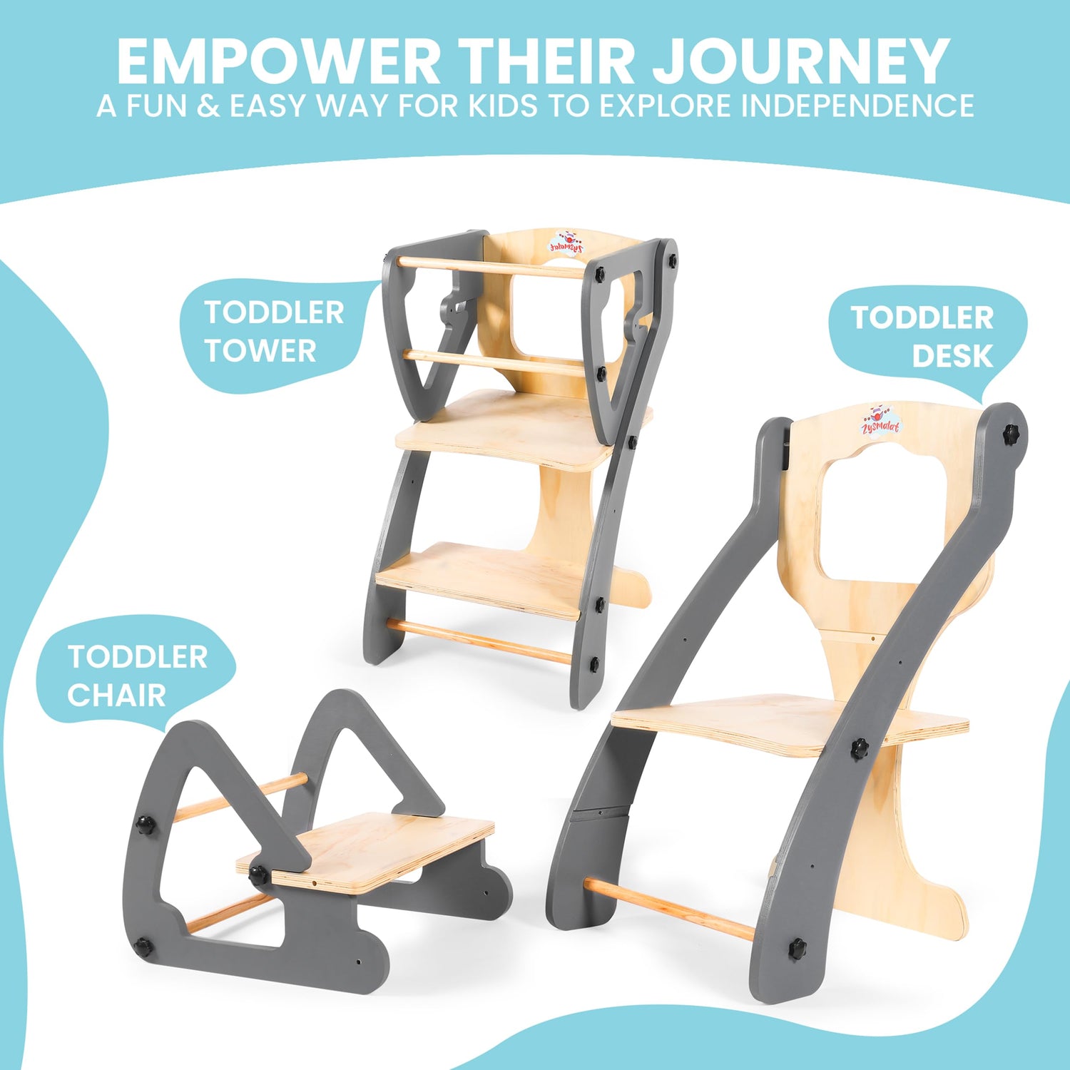 - MULTIPURPOSE - our toddler learning tower is great not only in the kitchen, but in the bathroom and playroom, too! It can easily be picked up and moved by a grown up to the bathroom to allow your child to reach the bathroom sink. Or you can put the standing tower in the playroom and easily reassemble it into a playful desk and chair by following the easy instructions included in the box.