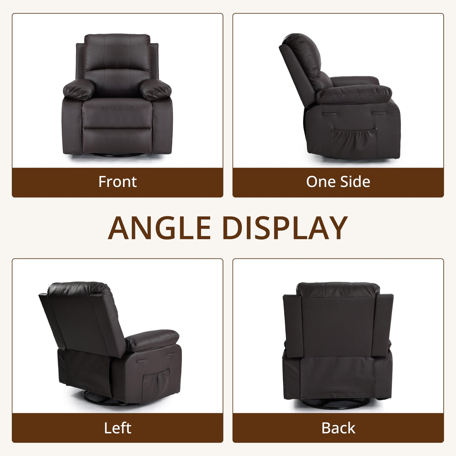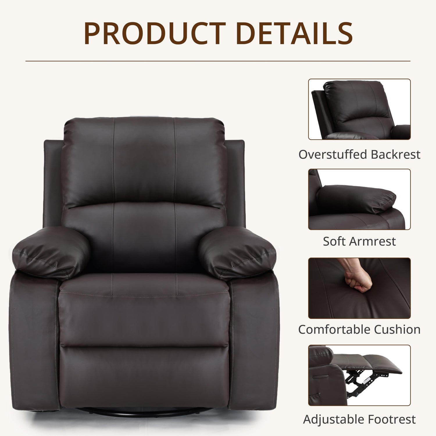 zzlay 360° Swivel Rocking Leather Recliner Chair for Adults, Overstuffed Manual Recliner with Spring Cushion, Glider Rocking Nursery Single Sofa with Side Pockets for Living Room, Coffee Brown