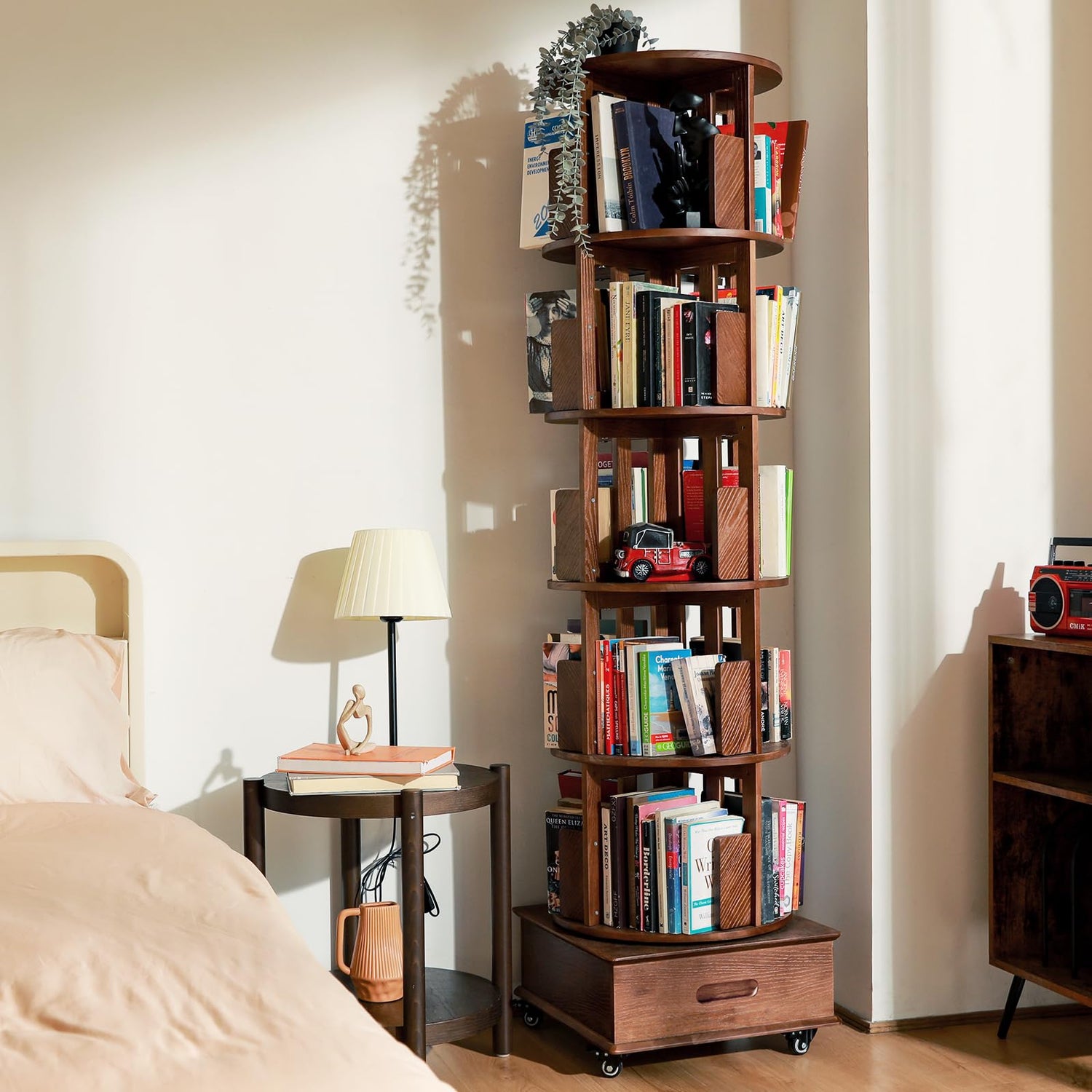 ZZV Solid Wood Rotating Bookshelf, 360° Display Bookcase with 1 Drawer, Spinning Bookshelf Tower with Wheels, 72 inch Tall Bookcase for Small Space, Revolving Book Shelf for Home Office, Walnut Finish