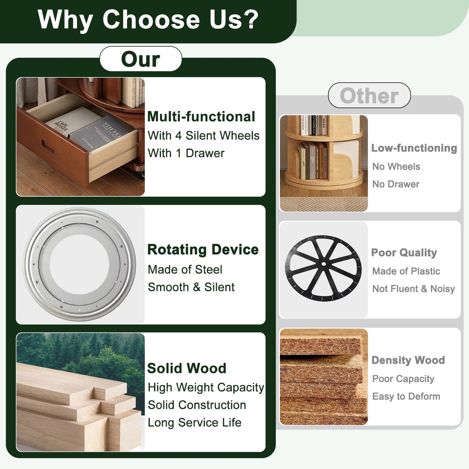 - Premium Solid Wood: Crafted from outstanding quality solid wood, this rotating bookshelf combines durability and elegance. The natural grain and finish bring warmth to any room, ensuring it not only serves a functional purpose but also enhances your home decor. Built to last, this piece will be a treasured addition for years to come.